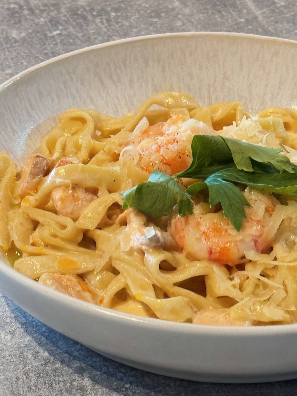 Паста том-ям із креветкою та лососем